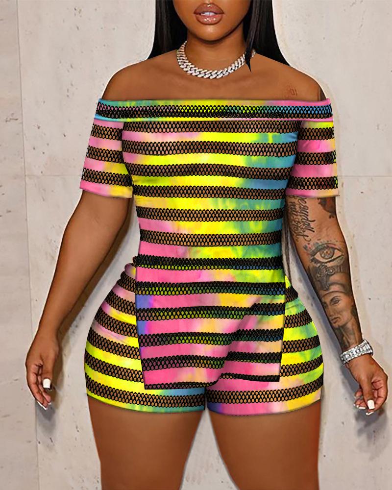 Style:Casual Type:Shorts Set Material:Polyester Neckline:Off the Shoulder Sleeve Style:Short Sleeve Length:Above Knee Pattern Type:Tie Dye Decoration:Slit,Sheer Mesh Fit Type:Skinny Occasion:Daily Package Include:1*Shorts Set