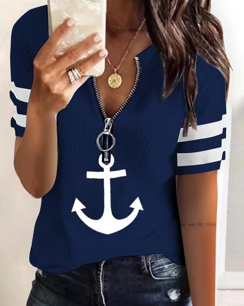 Style:Casual Type:Tee Material:95%Polyester,5%Silicone Neckline:V-Neck Sleeve Style:Short Sleeve Length:Regular Pattern Type:Anchor,Contrast Paneled Decoration:Zipper Fit Type:Regular Occasion:Daily Package Include:1*T-Shirt Fabric Elasticity:High Stretch Sheer:No Care Instructions:Machine wash or professional dry clean