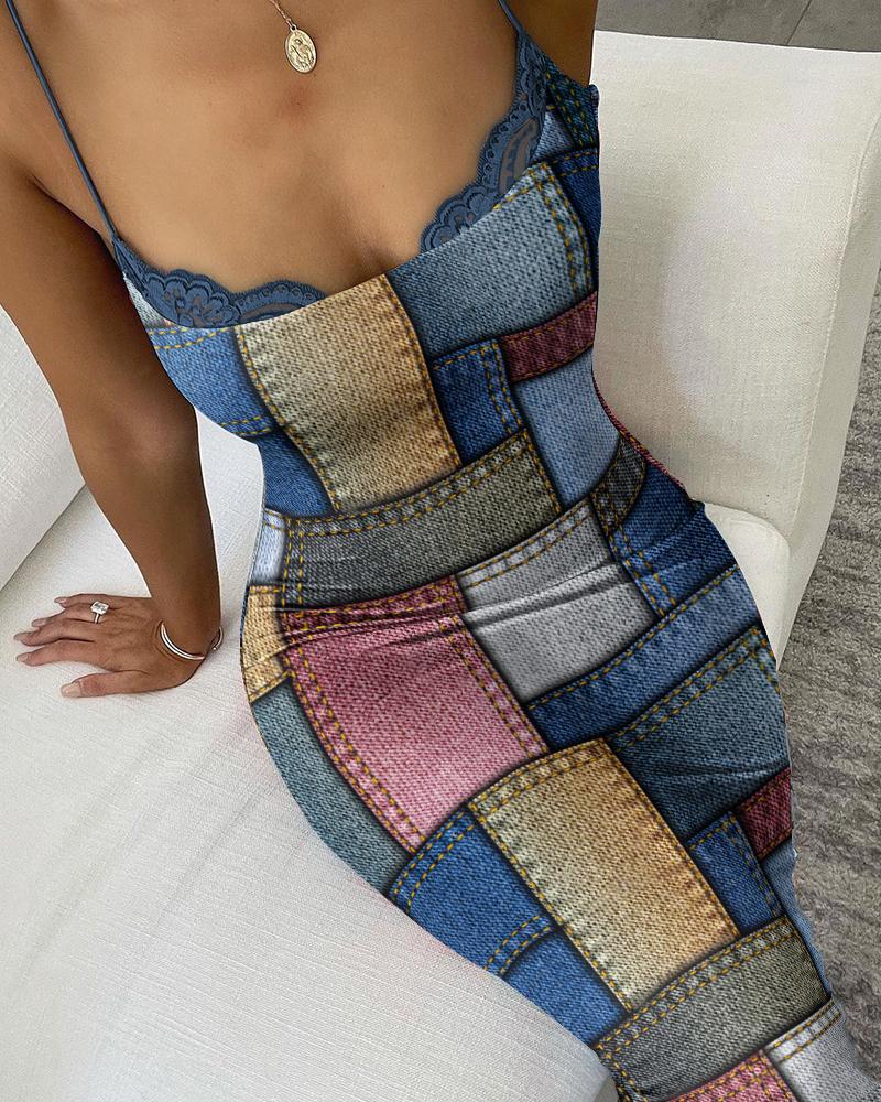 Denim Look Print Lace Trim Bodycon Dress