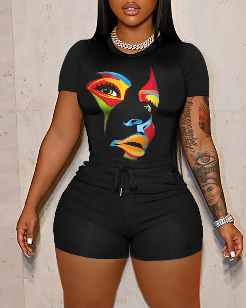 Abstract Figure Print Casual Top & Drawstring Shorts Set