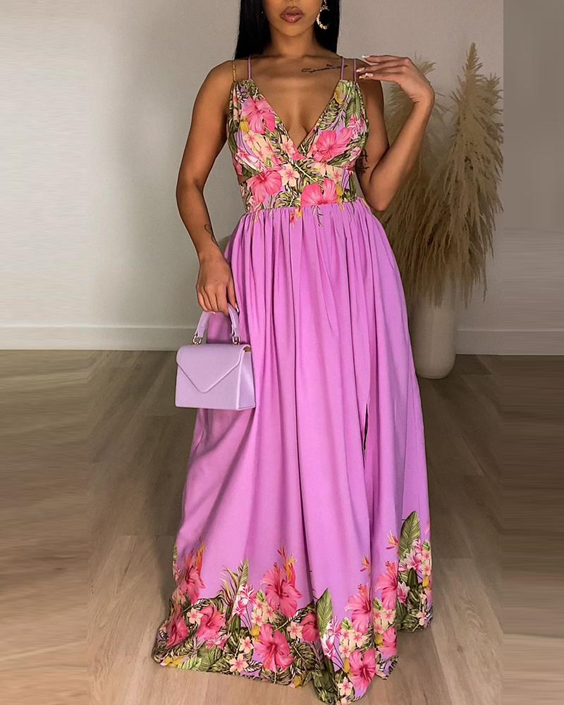 Style:Chic Type:Flared,Slit Material:Polyester Neckline:V-Neck Sleeve Style:Sleeveless Length:Maxi Pattern Type:Floral Decoration:Cutout Fit Type:Regular Occasion:Daily,Vacation Package Include:1* Dress