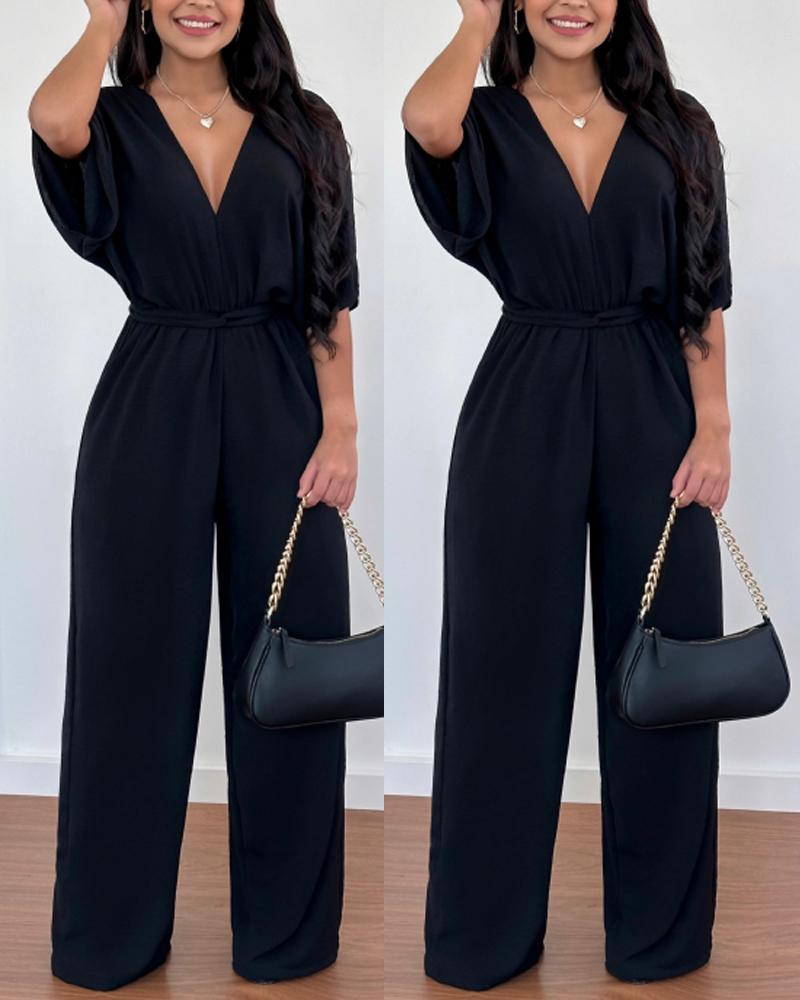 Style:Casual Type:Jumpsuit Material:Polyester Neckline:V-Neck Sleeve Style:Batwing Sleeve,Short Sleeve Length:Long Pattern Type:Plain Decoration:Backless,Tied Detail Fit Type:Regular Occasion:Daily Package Include:1*Jumpsuit Fabric Elasticity:Slight Stretch Sheer:No Care Instructions:Machine wash or professional dry clean