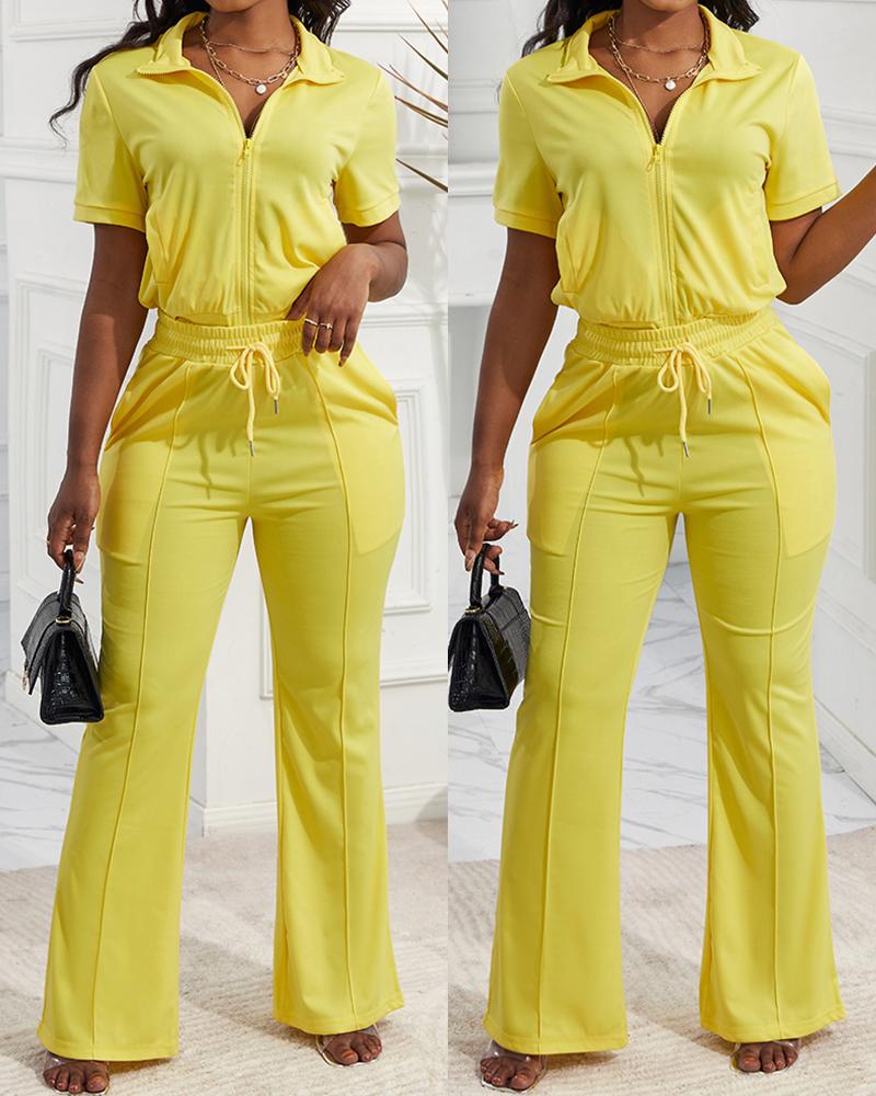 Style:Casual Type:Pants Sets Material:Polyester Neckline:Turn-down Collar Sleeve Style:Short Sleeve Length:Long Pattern Type:Plain Decoration:Drawstring,Pocket,Zipper Fit Type:Regular Occasion:Daily Package Include:1*Pants Set