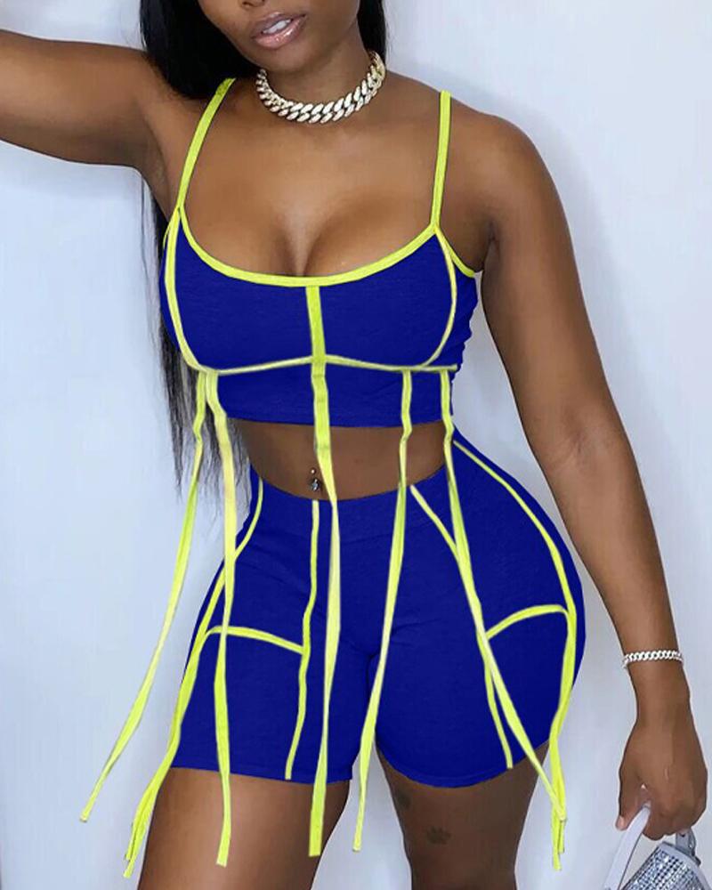 Style:Sexy Type:Shorts Set Material:Polyester Neckline:U-Neck Sleeve Style:Spaghetti Strap Length:Above Knee Pattern Type:Contrast Paneled Decoration:Contrast Binding Fit Type:Skinny Occasion:Daily Package Include:1*Shorts Set