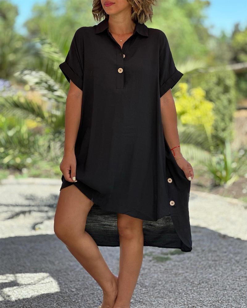 Style:Casual Type:Straight Material:100%Cotton Neckline:Turn-down Collar Sleeve Style:Short Sleeve Length:Asymmetrical Pattern Type:Plain Decoration:Button Fit Type:Regular Occasion:Daily,Vacation Package Include:1* Dress Fabric Elasticity:Slight Stretch