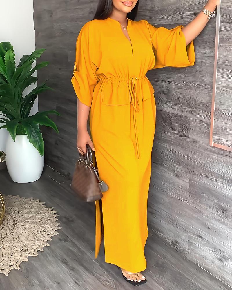 Style:Casual Type:Straight Material:Polyester Neckline:V-Cut Sleeve Style:Roll Up Sleeve,Three Quarters Length:Maxi Pattern Type:Plain Decoration:Drawstring,Slit Fit Type:Regular Occasion:Daily Package Include:1* Dress Fabric Elasticity:Slight Stretch Sheer:No Care Instructions:Machine wash or professional dry clean