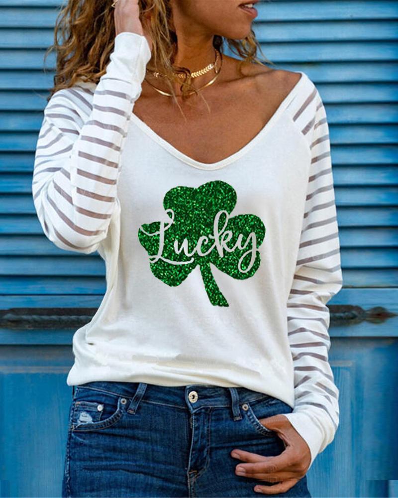 St. Patrick's Day Lucky Shamrock Print Contrast Mesh Long Sleeve Top