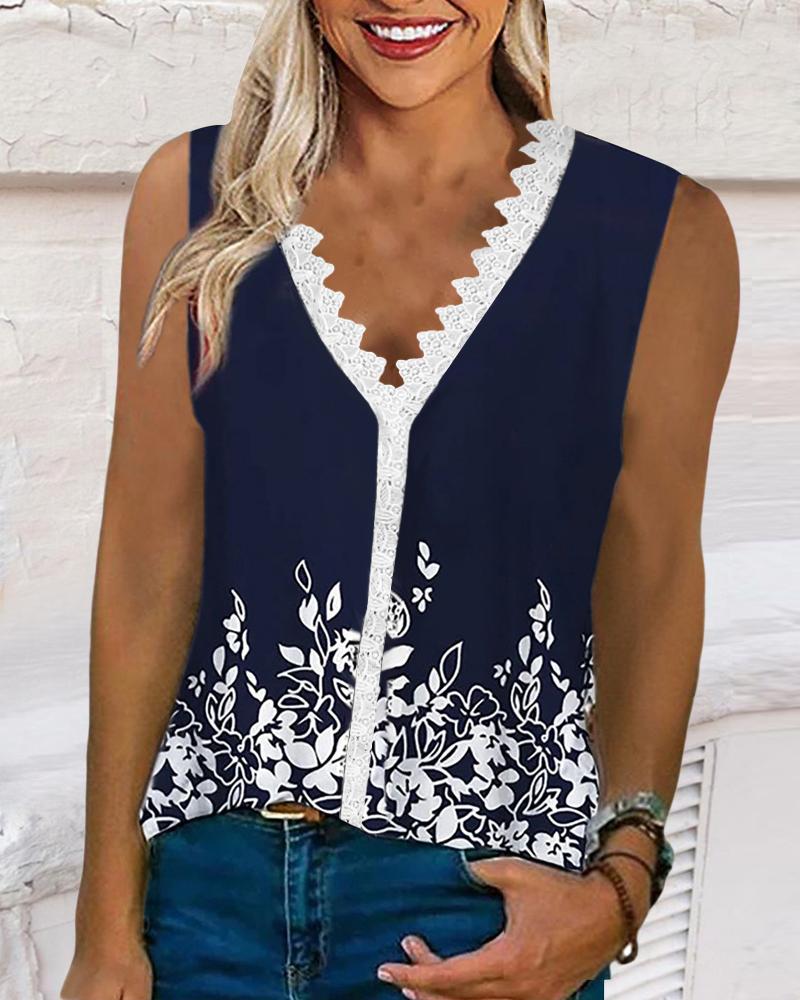 Style:Casual Type:Tank Material:Polyester Neckline:V-Neck Sleeve Style:Sleeveless Length:Regular Pattern Type:Plants Decoration:Contrast Lace Fit Type:Regular Occasion:Daily Package Include:1*Top