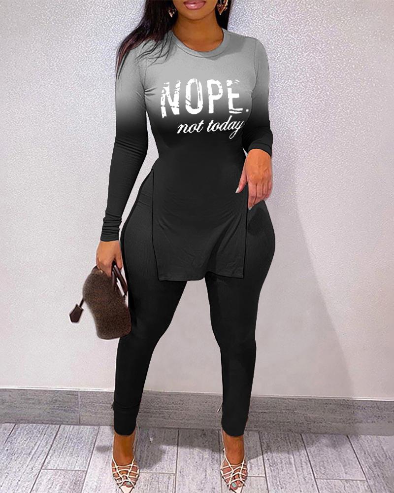Ombre Letter Print Split Hem Long Sleeve Top & High Waist Pants Set
