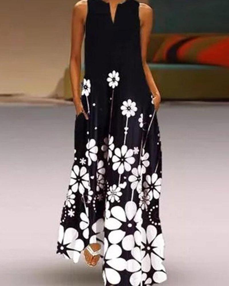 Style:Basics,Casual Type:Straight Material:95%Polyester,5%Elastane Neckline:V-Cut Sleeve Style:Sleeveless Length:Maxi Pattern Type:Floral Fit Type:Regular Occasion:Daily,Vacation Package Include:1* Dress