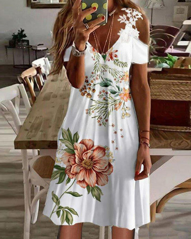 Style:Casual,Chic Type:A Line Material:95%Polyester,5%Elastane Neckline:Cold Shoulder,V-Neck Sleeve Style:Short Sleeve Length:Mini Pattern Type:Floral Decoration:Contrast Lace Fit Type:Regular Occasion:Daily,Vacation Package Include:1* Dress