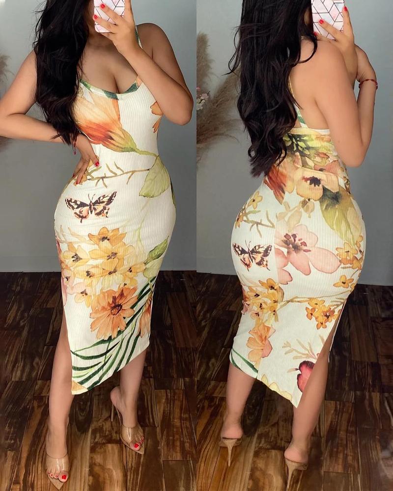 Floral Butterfly Print Split Hem Bodycon Dress