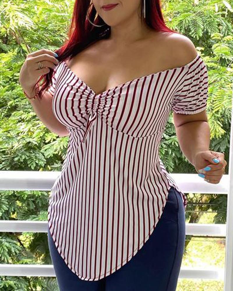 Style:Casual Type:Blouses Material:Polyester Neckline:V-Neck Sleeve Style:Short Sleeve Length:Regular Pattern Type:Striped Decoration:Ruched Fit Type:Regular Occasion:Daily Package Include:1* Blouse