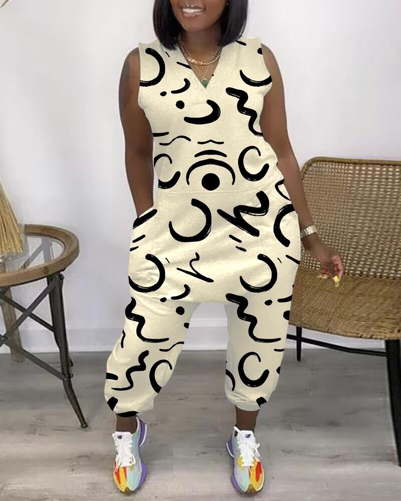 Abstract Print Pocket Design Sleeveless Jumpsuit