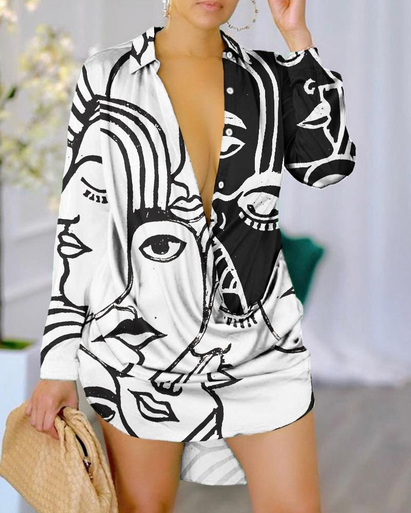 Abstract Figure Print Long Sleeve Draped Shirt Dress