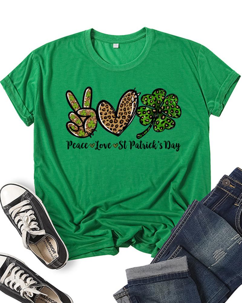 St. Patrick's Day Leopard Scissorhands Clover Letter Print Casual T-shirt