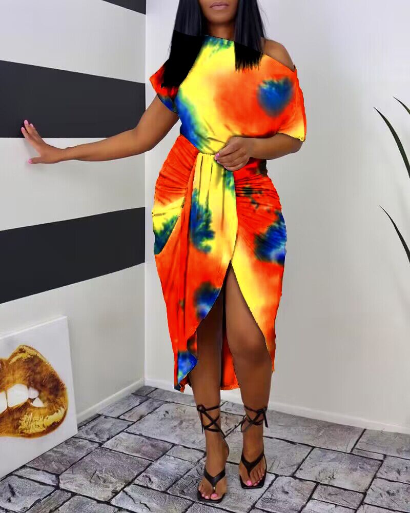 Style:Sexy Type:Slit Material:Polyester Neckline:Skew Neck Sleeve Style:Short Sleeve Length:Midi Pattern Type:Tie Dye Decoration:Ruched,Slit Fit Type:Skinny Occasion:Daily Package Include:1* Dress