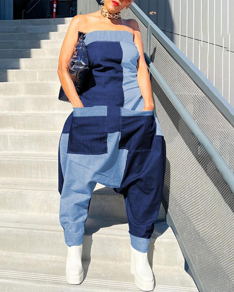 Colorblock Patchwork Pocket Detail Bandeau Jumpsuit