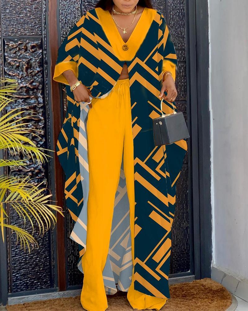 Geometric Print High Slit Longline Top & Pants Set