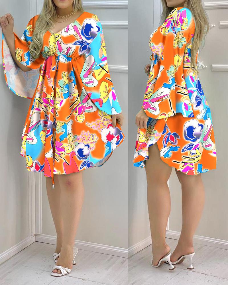 Allover Print Cloak Sleeve Drawstring Casual Dress