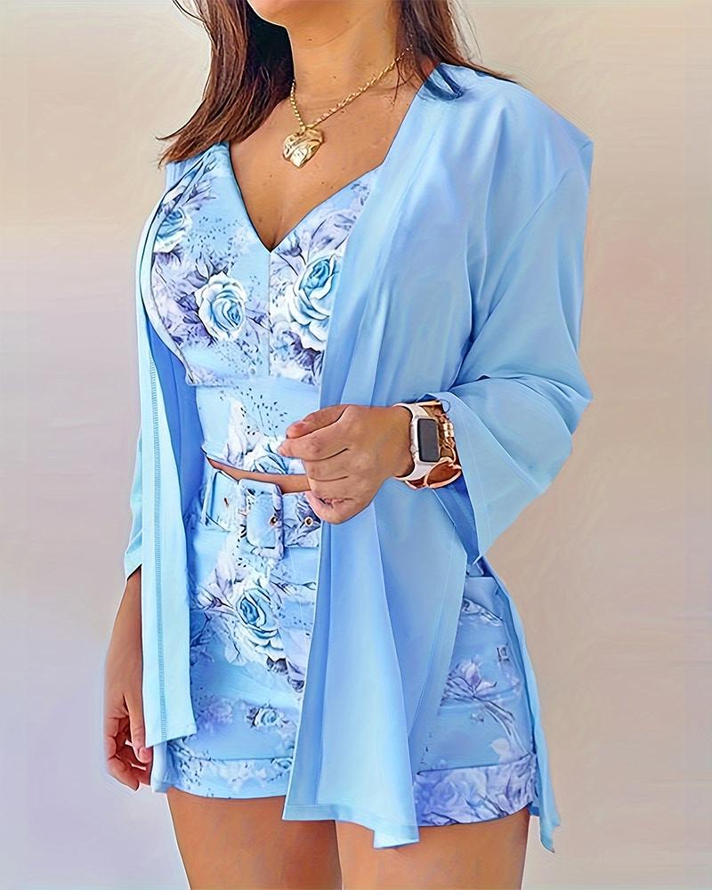 Spaghetti Strap Floral Print Top & Shorts Set With Coat