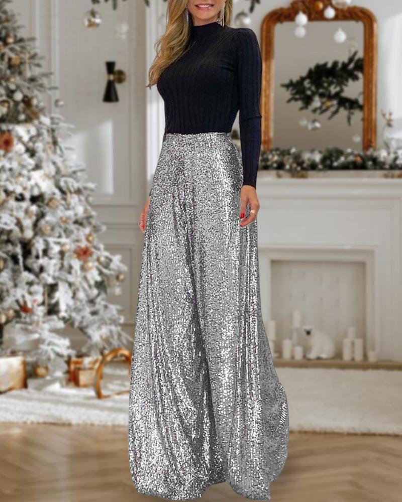 High Waist Sequin Wide Leg Flared Pants