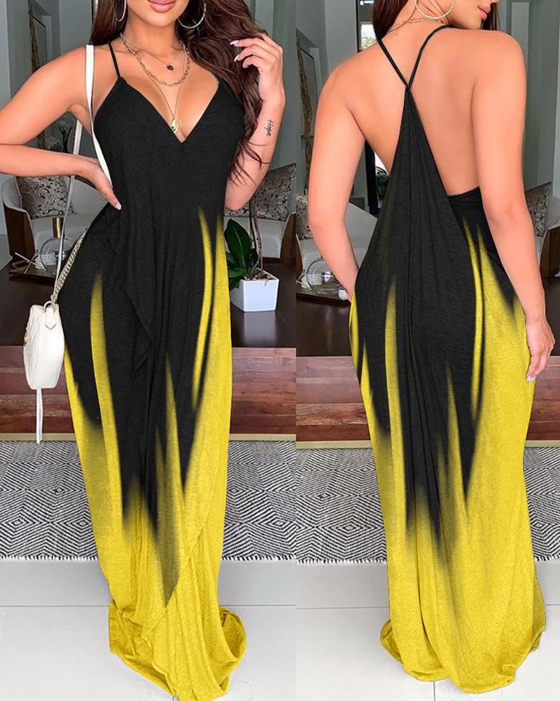 Style:Chic Type:Straight Material:Polyester Neckline:V-Neck Sleeve Style:Sleeveless Length:Maxi Pattern Type:Tie Dye,Ombre Decoration:Backless Fit Type:Regular Occasion:Daily,Vacation Package Include:1* Dress