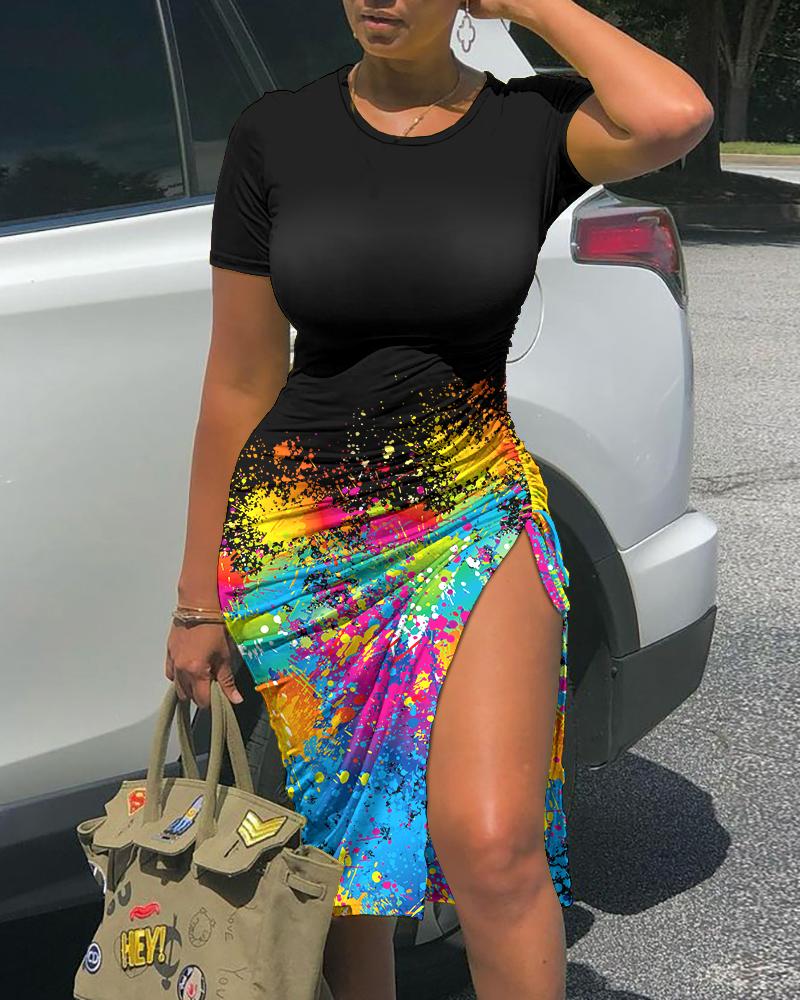 Style:Chic Type:Slit Material:Polyester Neckline:O-neck Sleeve Style:Short Sleeve Length:Midi Pattern Type:Ink Splash Decoration:Drawstring,Ruched,Slit Fit Type:Skinny Occasion:Daily Package Include:1* Dress