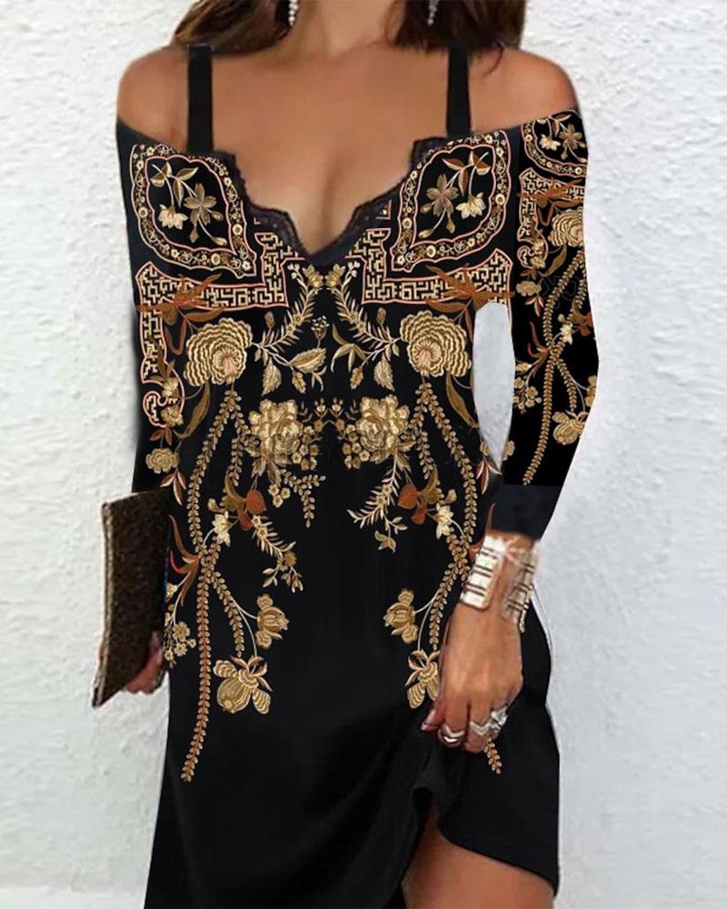 Style:Casual,Vintage Type:Straight Material:95%Polyester,5%Elastane Neckline:Cold Shoulder Sleeve Style:Long Sleeve Length:Mini Pattern Type:Tribal Fit Type:Regular Occasion:Daily Package Include:1* Dress