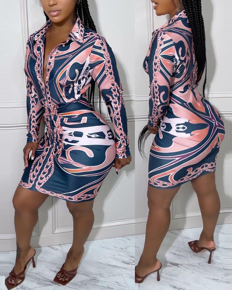 Scarf Chain Print Long Sleeve Ruched Shirt Dress