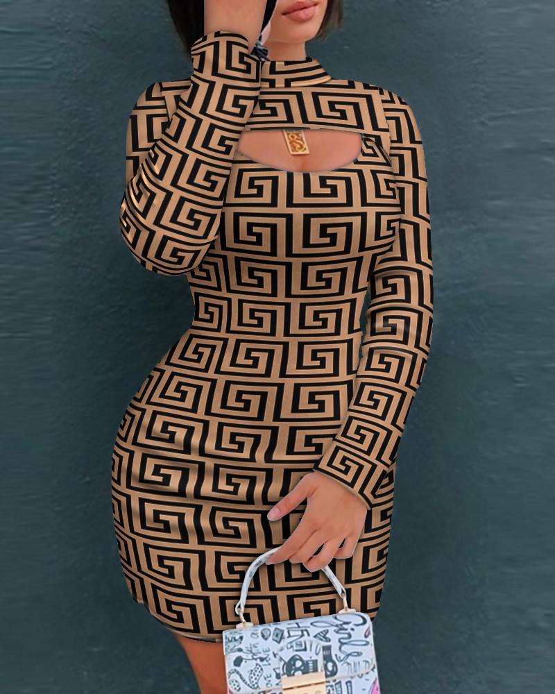 Geometric Print Cutout Long Sleeve Bodycon Dress