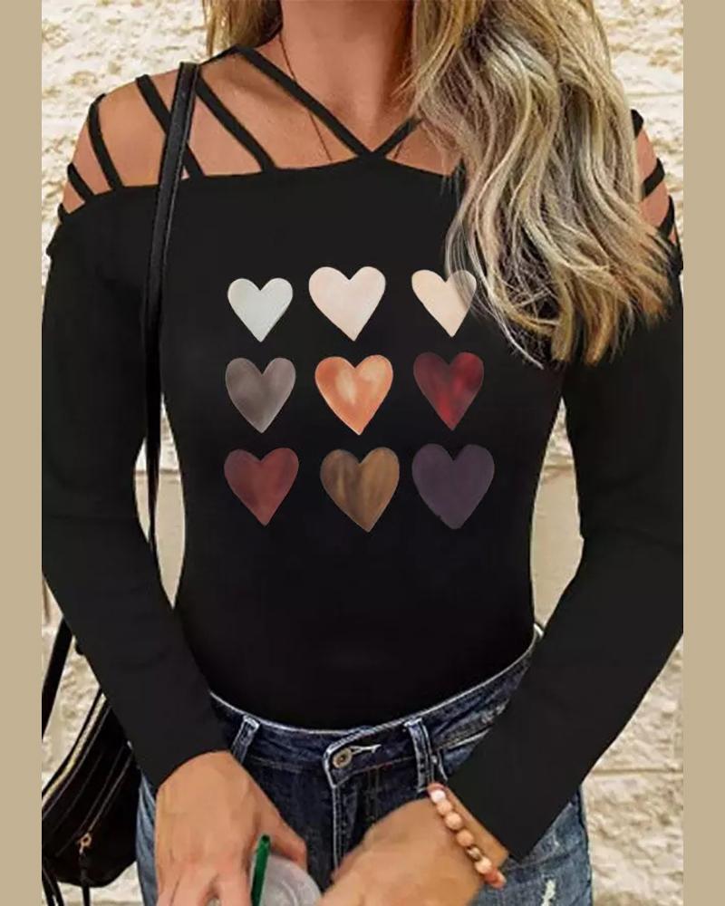 Style:Chic Type:Tee Material:95%Polyester,5%Elastane Neckline:Cold Shoulder Sleeve Style:Long Sleeve Length:Regular Pattern Type:Heart Fit Type:Regular Occasion:Daily Package Include:1*Top