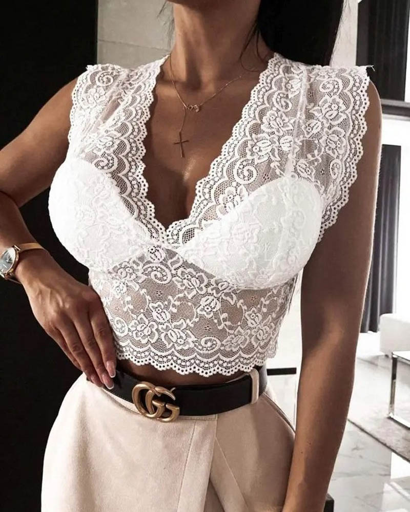 Style:Casual,Chic Type:Tank Material:95%Polyester,5%Elastane Neckline:V-Neck Sleeve Style:Sleeveless Length:Crop Pattern Type:Floral Decoration:Lace,Zipper Fit Type:Regular Occasion:Daily Package Include:1*Top
