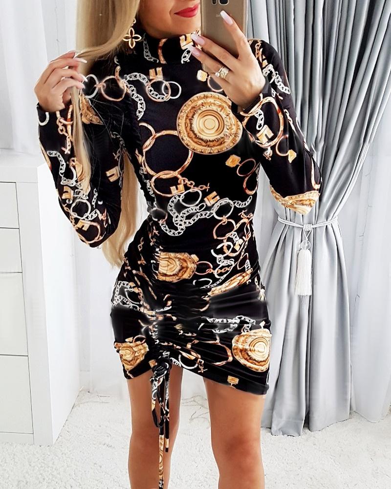 Style:Sexy,Vintage Type:Bodycon Material:Polyester Neckline:Mock Neck Sleeve Style:Long Sleeve Length:Mini Pattern Type:Baroque,Chain Decoration:Drawstring,Ruched Fit Type:Skinny Occasion:Daily Package Include:1* Dress