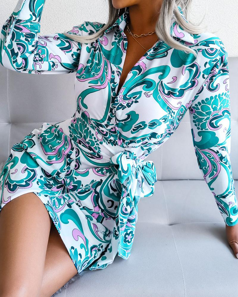 Style:Casual,Vintage Type:Shirt,Wrap Material:Polyester Neckline:Turn-down Collar Sleeve Style:Long Sleeve Length:Mini Pattern Type:Baroque Decoration:Tied Detail Fit Type:Regular Occasion:Daily Package Include:1* Dress