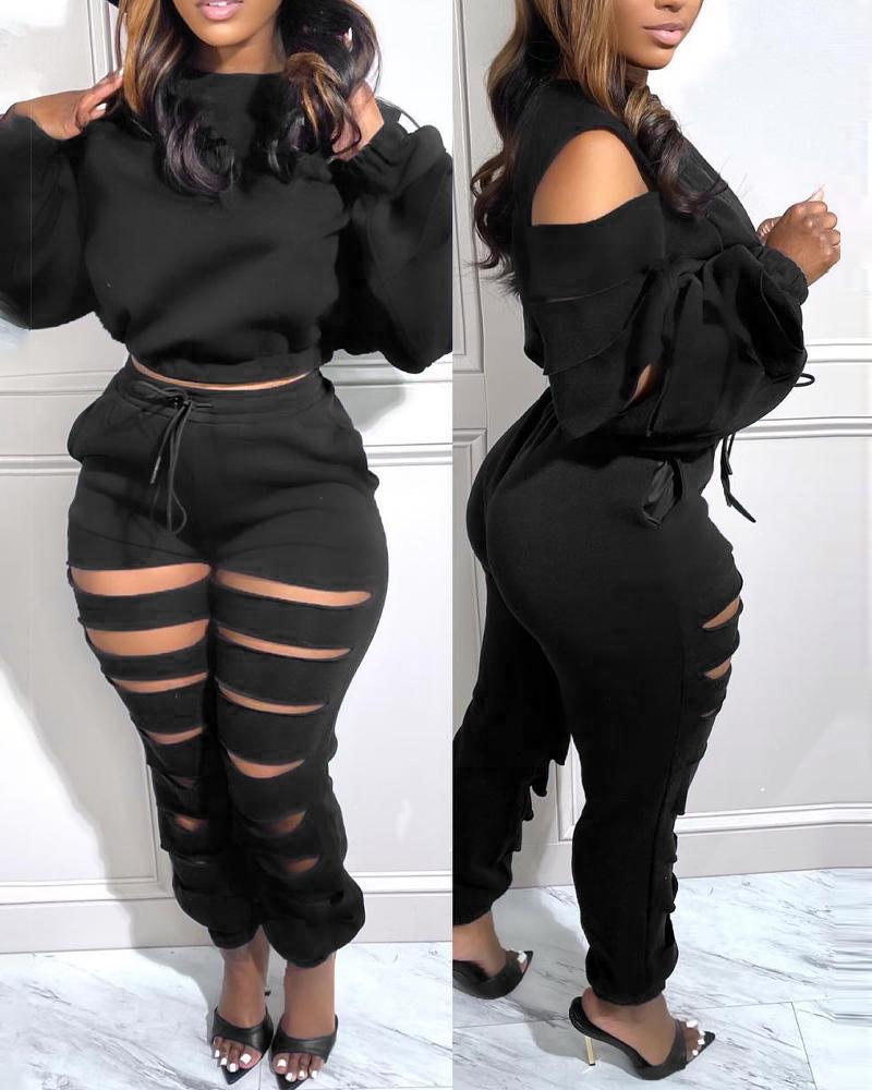 Style:Casual Type:Sweatpants Sets,Sweatshirt Sets Material:Polyester Neckline:Cold Shoulder Sleeve Style:Long Sleeve Length:Long Pattern Type:Plain Decoration:Cutout,Drawstring Fit Type:Regular Occasion:Daily Package Include:1*Pants Set