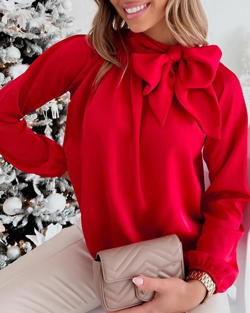 Style:Casual,Chic Type:Blouses Material:97%Polyester,3%Elastane Neckline:Tie Neck Sleeve Style:Lantern Sleeve,Long Sleeve Length:Regular Pattern Type:Plain Decoration:Lantern Sleeve,Tied Detail Fit Type:Regular Occasion:Daily Package Include:1*Blouse