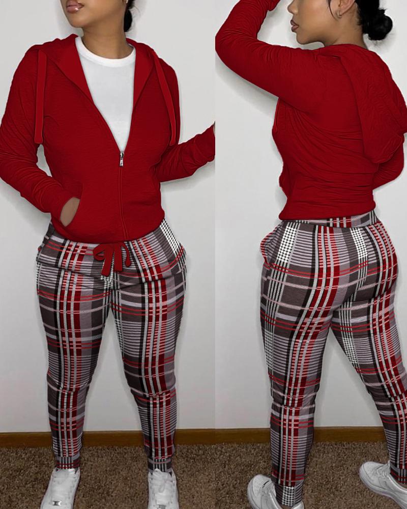 Long Sleeve Zip Up Hooded Top & Plaid Print Pants Set