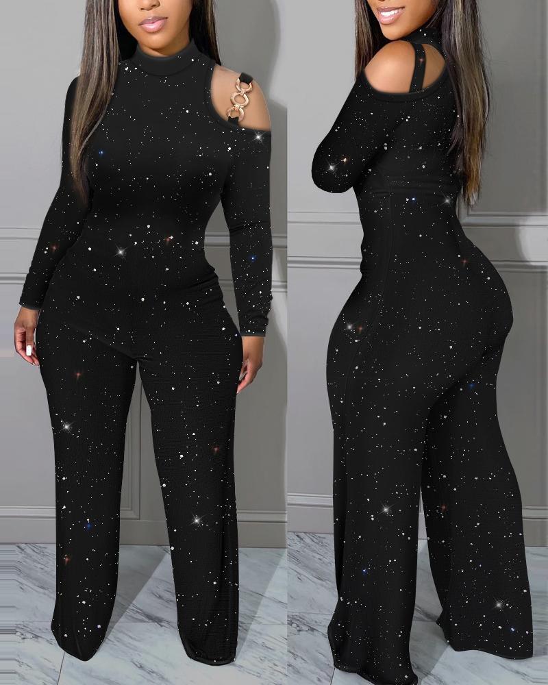 Glitter Metal Decor Cold Shoulder Jumpsuit