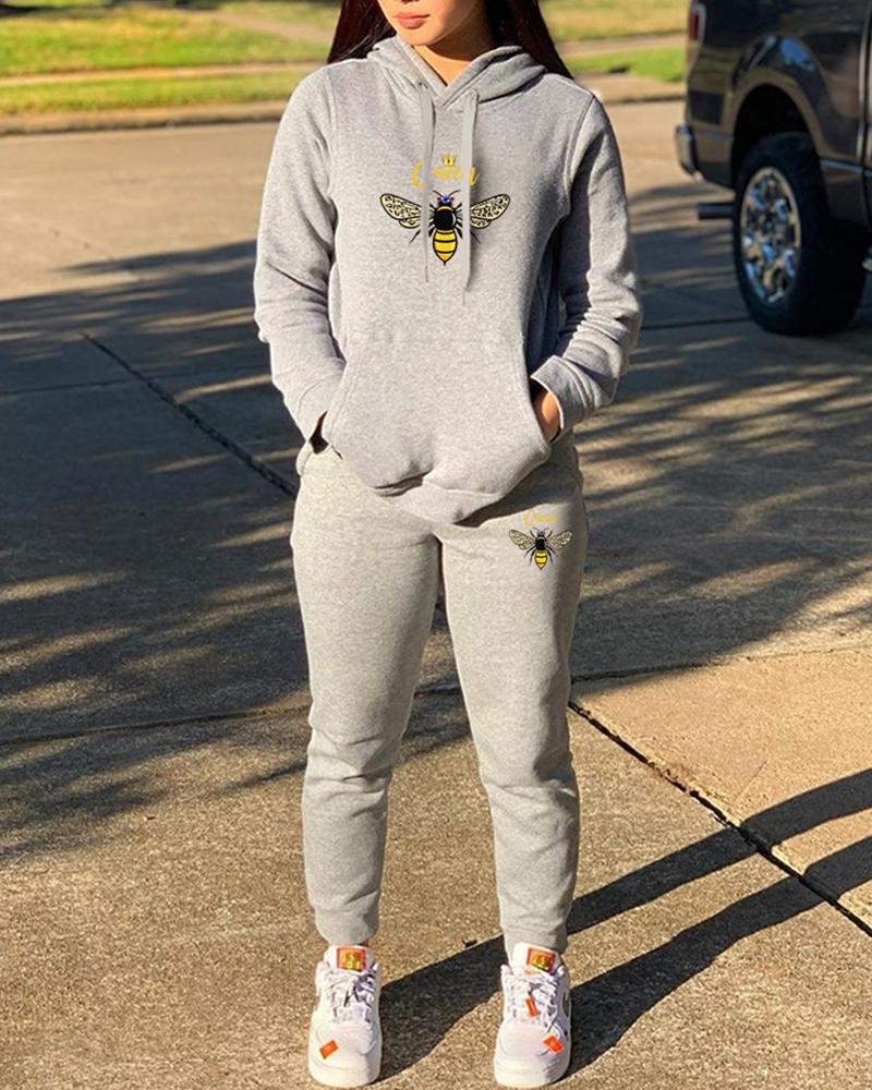 Bee Pattern Colorblock Hooded Top & Pants Set