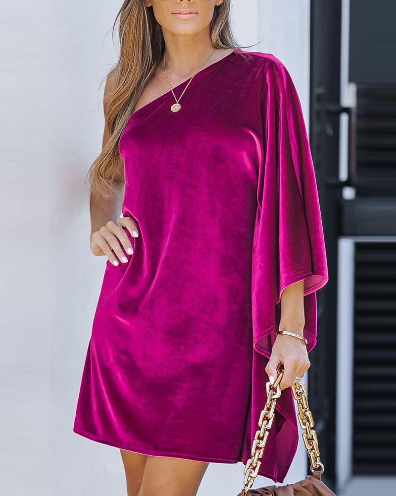 Style:Chic,Sexy Type:A Line Material:Velvet Neckline:One Shoulder Sleeve Style:Long Sleeve,Bell Sleeve Length:Mini Pattern Type:Plain Fit Type:Regular Occasion:Daily Package Include:1* Dress