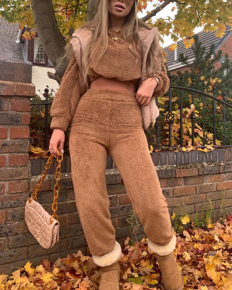 Style:Chic Type:Sweatpants Sets,Sweatshirt Sets Material:Polyester Neckline:Round Neck Sleeve Style:Long Sleeve Length:Long Pattern Type:Plain Fit Type:Regular Occasion:Daily Package Include:Pants Sets