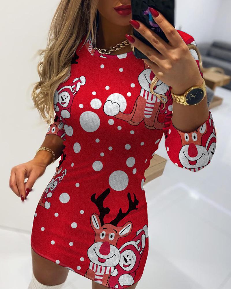 Christmas Elk Print Long Sleeve Bodycon Dress