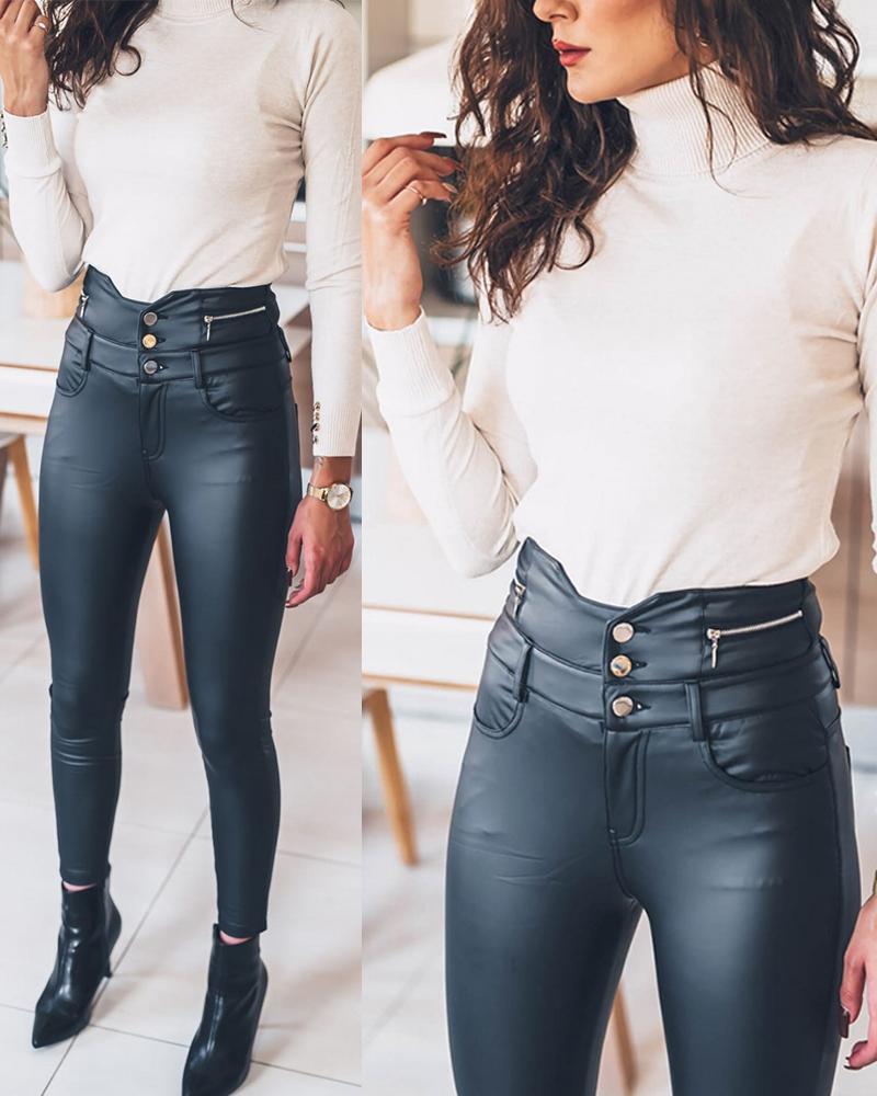High Waist Button Front PU Leather Pants
