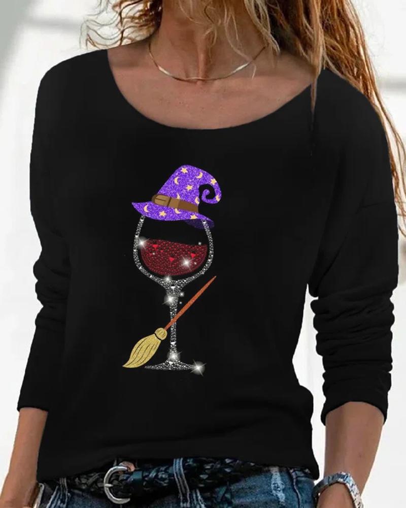Halloween Wine Glasses Print Long Sleeve Top