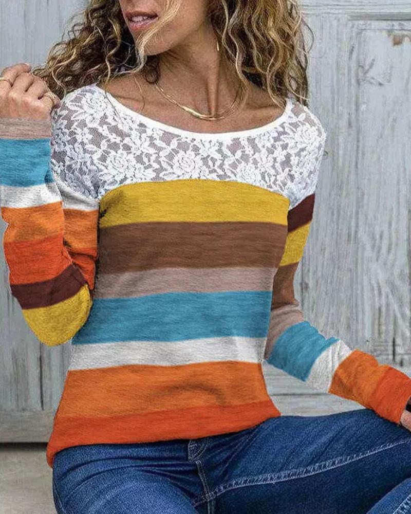 Style:Casual Type:Tee Material:Polyester Neckline:Round Neck Sleeve Style:Long Sleeve Length:Regular Pattern Type:Striped Decoration:Contrast Lace Fit Type:Regular Occasion:Daily Package Include:1*Top