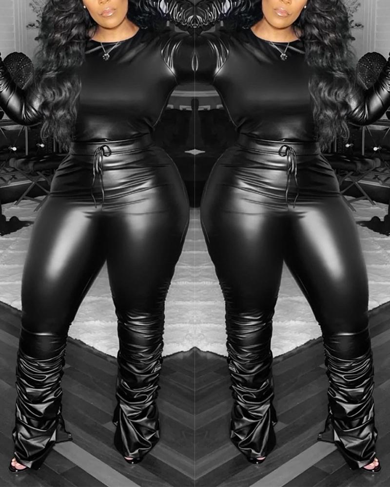 Style:Casual Type:Pants Sets Material:PU Leather,Polyester Neckline:O-neck Sleeve Style:Long Sleeve Length:Long Pattern Type:Plain Decoration:Drawstring,Ruched Fit Type:Skinny Occasion:Daily Package Include:1*Pants Set