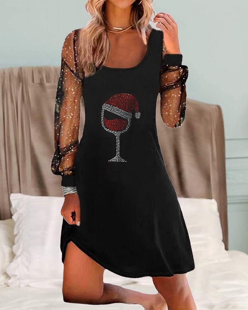 Christmas Wine Glass Print Contrast Mesh Casual Dress