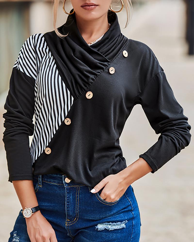 Style:Casual Type:Tee Material:95%Polyester,5%Elastane Neckline:V-Neck Sleeve Style:Long Sleeve Length:Regular Pattern Type:Colorblock,Striped Decoration:Button,Ruched Fit Type:Regular Occasion:Daily Package Include:1*Top