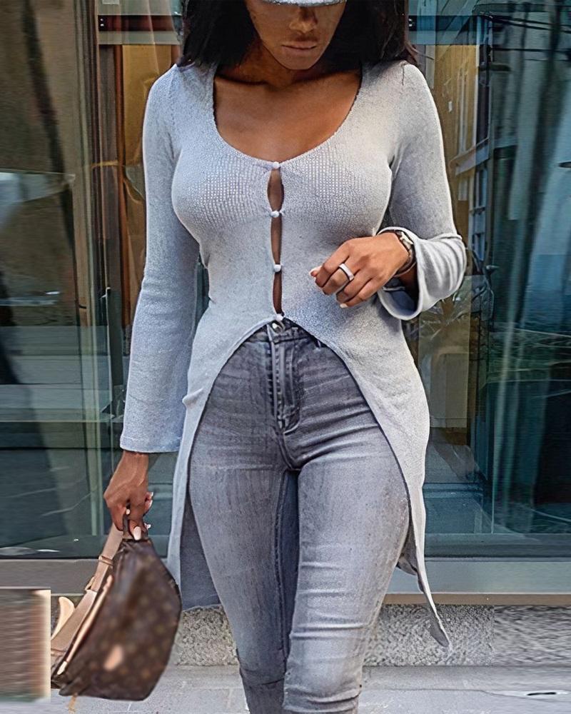Style:Casual Type:Tee,Ribbed Top Material:Ribbed Neckline:V-Neck Sleeve Style:Long Sleeve Length:Asymmetrical Pattern Type:Plain Decoration:Button Fit Type:Skinny Occasion:Daily Package Include:1*Top